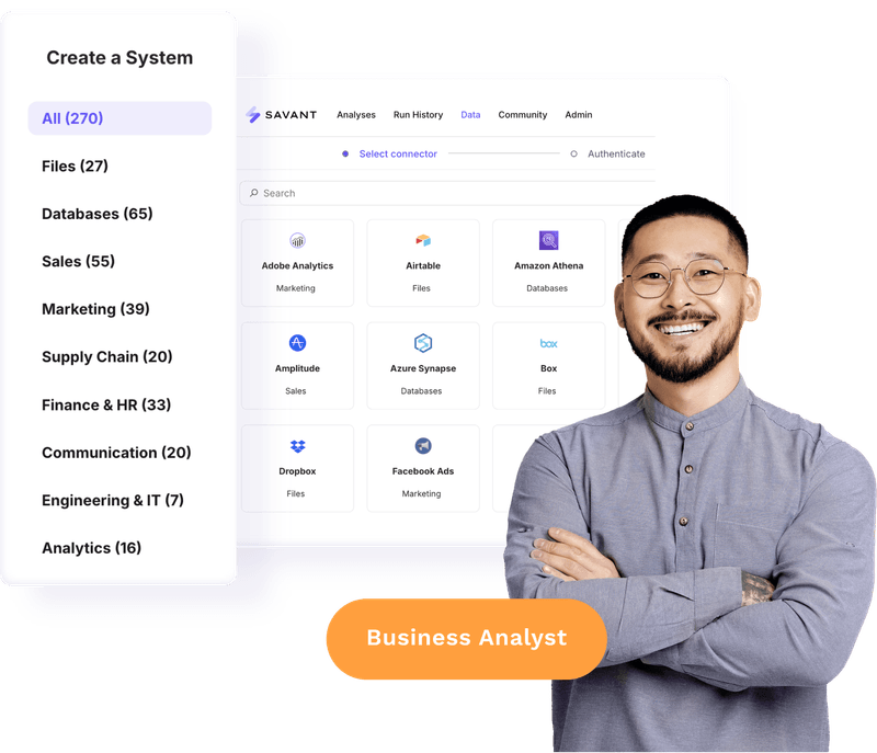 Savant’s 200+ connectors integrate seamlessly with your data sources — whether traditional or modern data platforms, cloud-based warehouses, cloud-based databases, or business apps.
