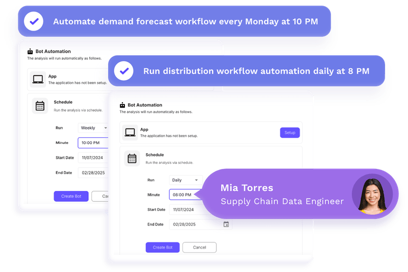 Build custom analytics bots with Savant to automate demand analysis, optimize distribution, and ensure timely delivery to target markets. Enable cross-team collaboration without coding expertise.